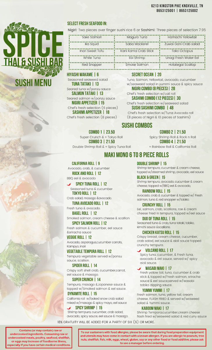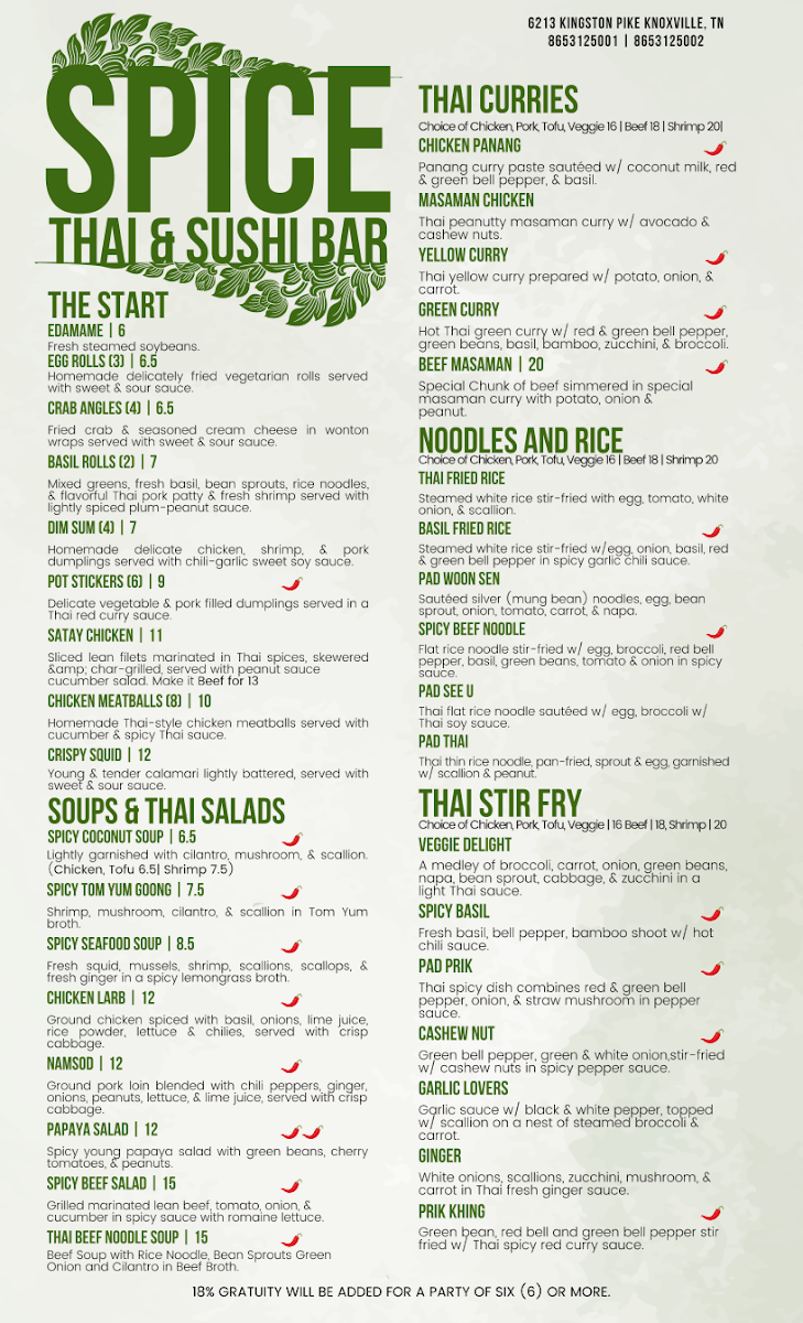 Welcome to Spice Thai & Sushi, a culinary gem nestled in the vibrant heart of Knoxville, TN. Located at 6213 Kingston Pike, this restaurant has swiftly gained a reputation for delivering a delightful array of authentic Thai cuisine and exquisite sushi. With a commitment to quality ingredients and bold flavors, Spice Thai & Sushi offers a unique dining experience that is hard to forget.